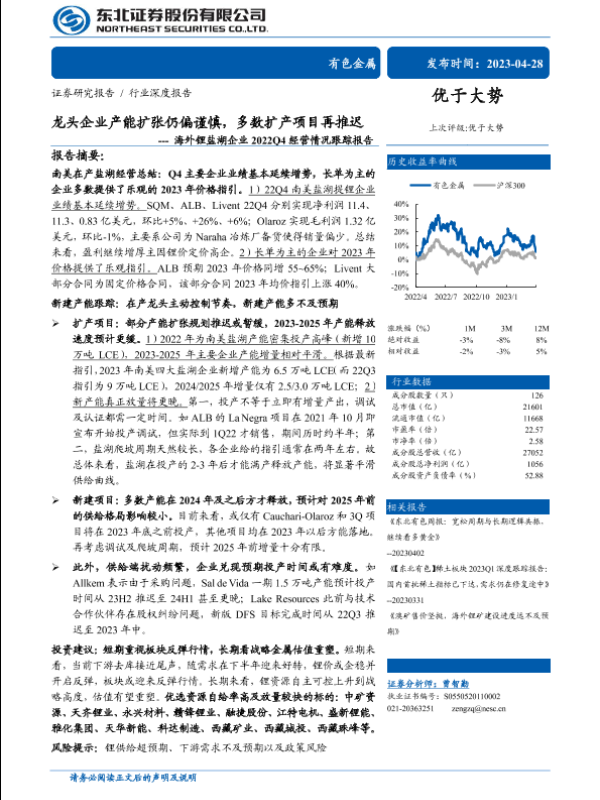 【东北证券】【20230428】龙头企业产能扩张仍偏谨慎,多数扩产项目再推迟---海外锂盐湖企业2022Q4经营情况跟踪报告-38页