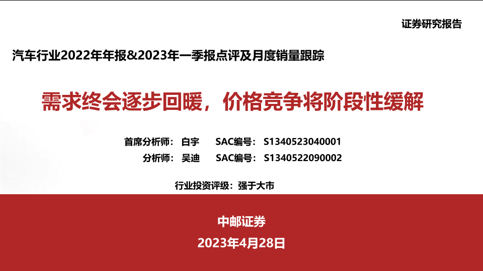 【中邮证券】【20230428】汽车行业2022年年报&2023年一季报点评及月度销量跟踪:需求终会逐步回暖,价格竞争将阶段性缓解-48页