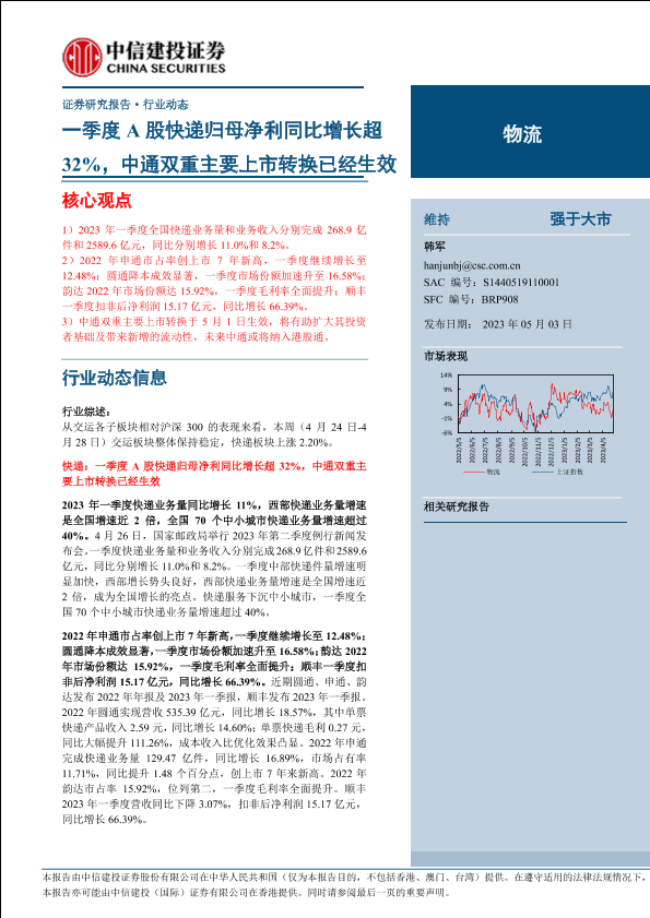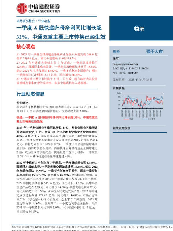 【中信建投证券】【20230503】物流行业:一季度A股快递归母净利同比增长超32%,中通双重主要上市转换已经生效-25页