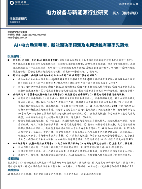 【国金证券】【20230502】电力设备与新能源行业深度研究:AI+电力场景明晰,新能源功率预测及电网运维有望率先落地-35页