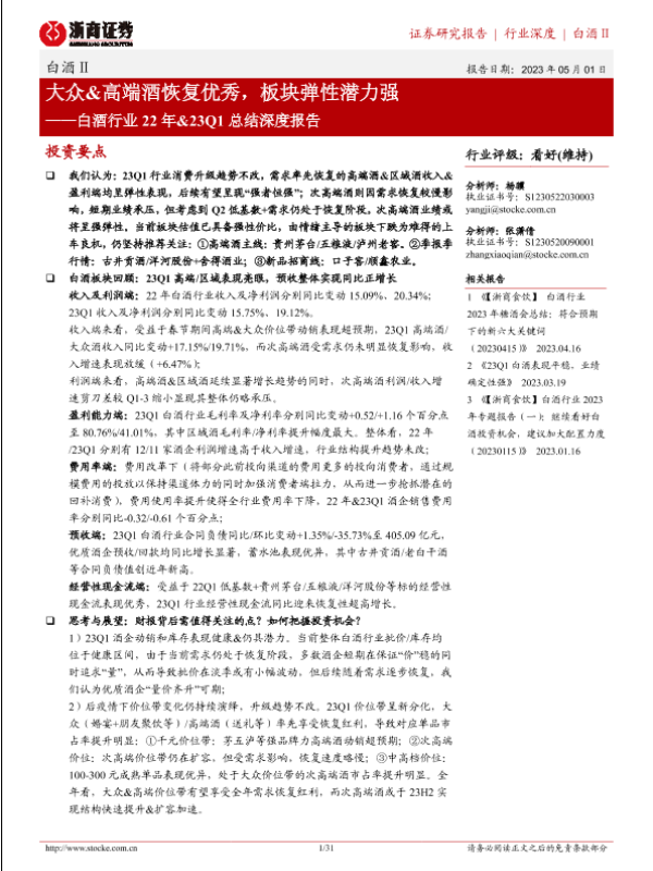 【浙商证券】【20230501】白酒行业22年&23Q1总结报告:大众&高端酒恢复优秀,板块弹性潜力强-31页