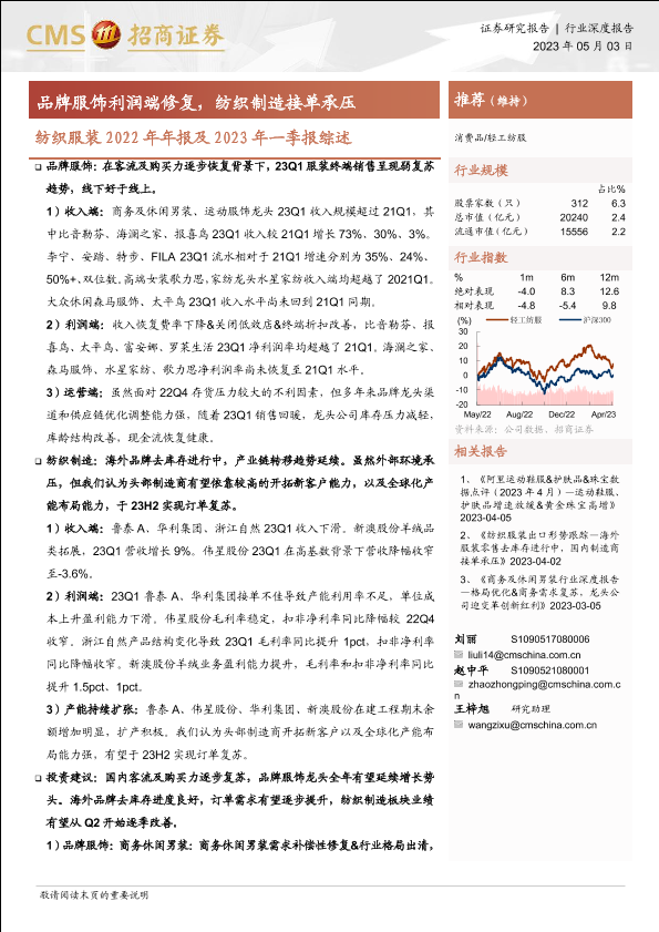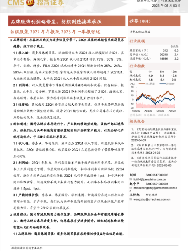 【海通证券】【20230503】纺织服装行业2022年年报及2023年一季报综述:品牌服饰利润端修复,纺织制造接单承压-20页