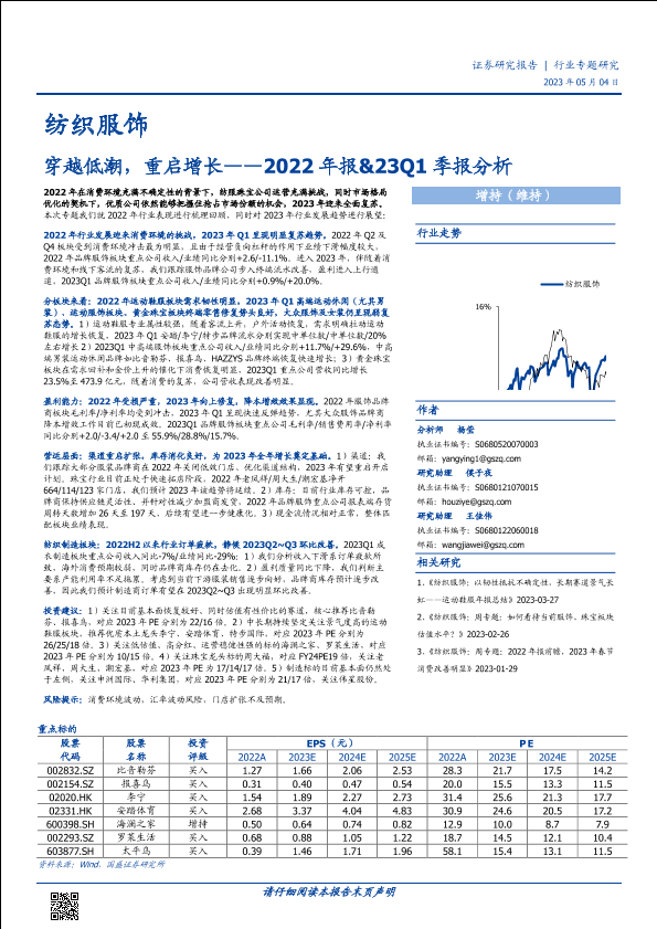 【国盛证券】【20230504】纺织服饰行业2022年报&23Q1季报分析:穿越低潮,重启增长-43页
