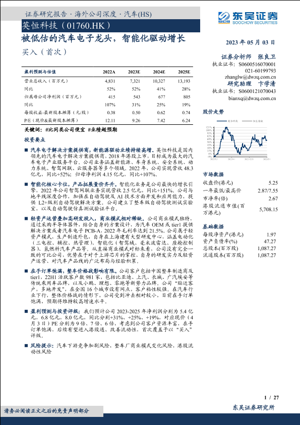 【东吴证券】【20230503】英恒科技(01760)被低估的汽车电子龙头,智能化驱动增长-27页