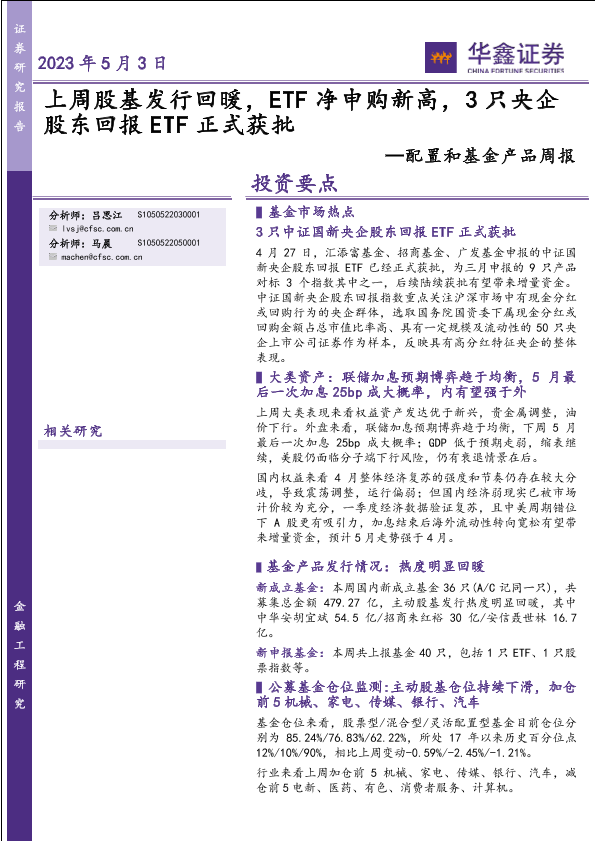 【华鑫证券】【20230503】配置和基金产品周报:上周股基发行回暖,ETF净申购新高,3只央企股东回报ETF正式获批-22页