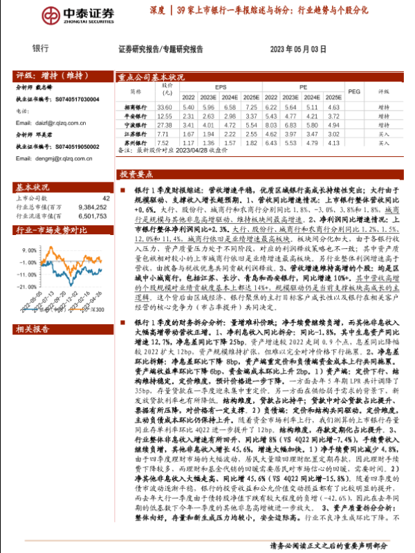 【中泰证券】【20230503】银行业深度:39家上市银行一季报综述与拆分,行业趋势与个股分化-40页