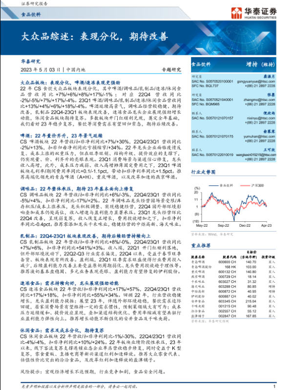 【华泰证券】【20230503】食品饮料行业专题研究:大众品综述,表现分化,期待改善-24页