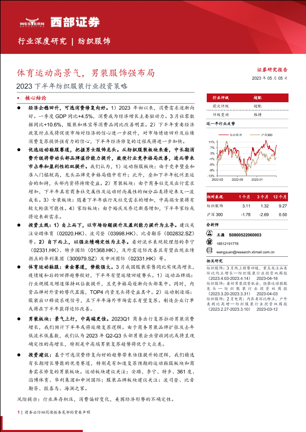 【西部证券】【20230505】2023下半年纺织服装行业投资策略:体育运动高景气,男装服饰强布局-30页