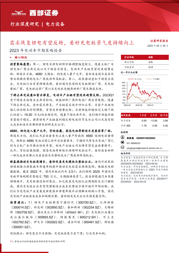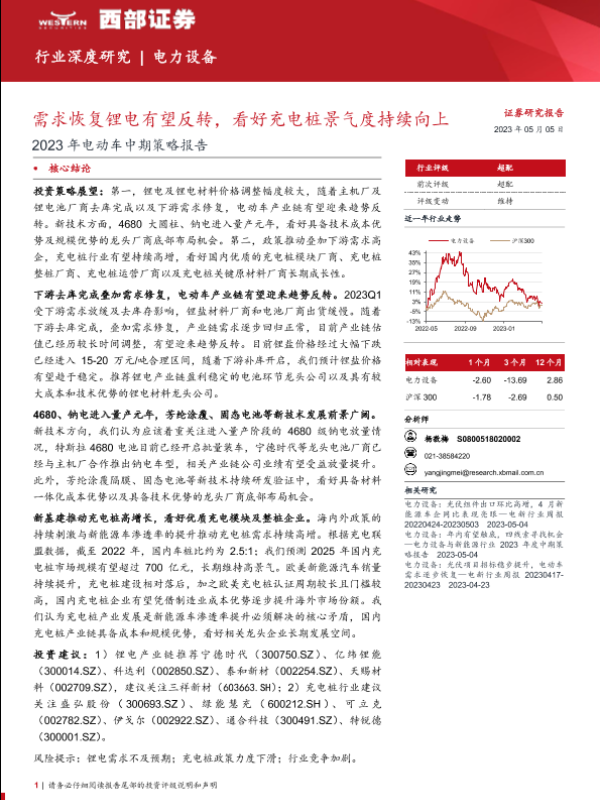 【西部证券】【20230505】2023年电动车行业中期策略报告:需求恢复锂电有望反转,看好充电桩景气度持续向上-48页