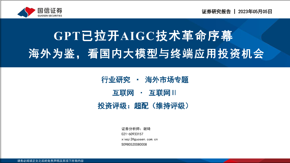 【国信证券】【20230505】互联网行业GPT已拉开AIGC技术革命序幕:海外为鉴,看国内大模型与终端应用投资机会-50页