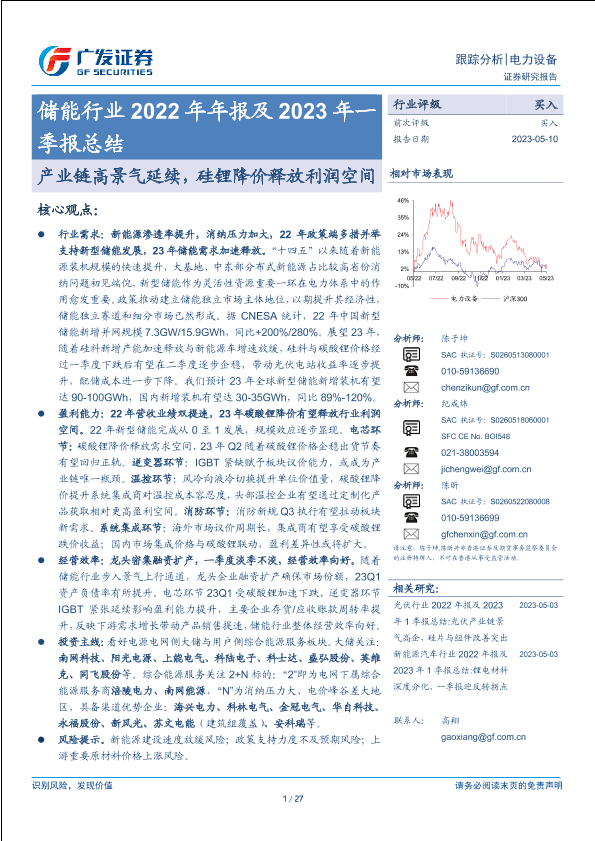 【广发证券】【20230510】储能行业2022年年报及2023年一季报总结:产业链高景气延续,硅锂降价释放利润空间-27页