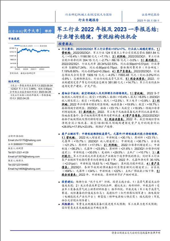 【海通证券】【20230509】军工行业2022年报及2023一季报总结:行业增长稳健,重视结构性机会-32页
