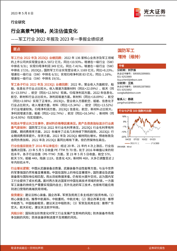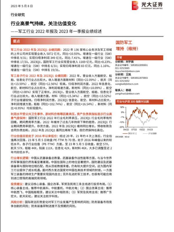 【光大证券】【20230508】军工行业2022年报及2023年一季报业绩综述:行业高景气持续,关注估值变化-25页