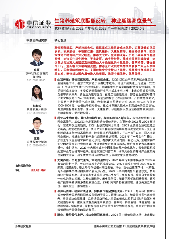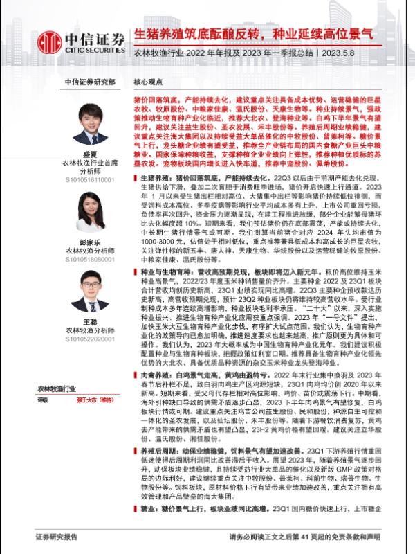 【中信证券】【20230508】农林牧渔行业2022年年报及2023年一季报总结:生猪养殖筑底酝酿反转,种业延续高位景气-42页