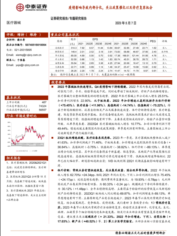 医疗器械 投资建议 政策催化 疫情影响 诊疗复苏