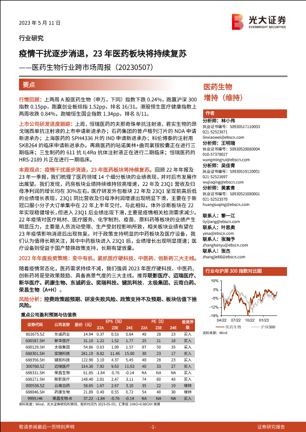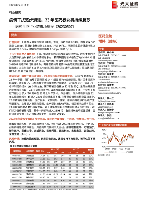 【光大证券】【20230511】医药生物行业跨市场周报:疫情干扰逐步消退,23年医药板块将持续复苏-43页