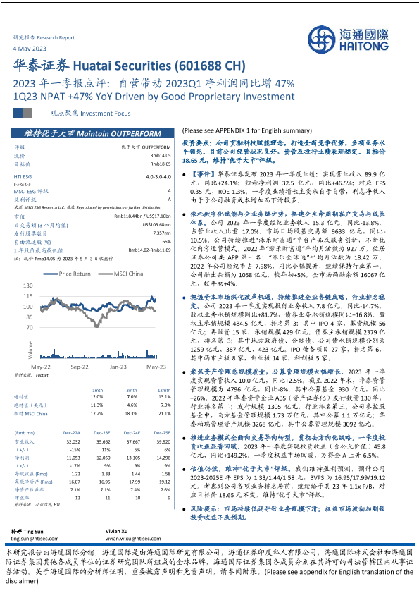 【海通国际】【20230507】华泰证券(601688)2023年一季报点评:自营带动2023Q1净利润同比增47%-15页