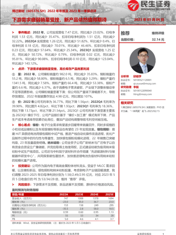 【民生证券】【20230506】博迁新材605376.SH2022年年报及2023年一季报点评:下游需求疲弱销量受挫,新产品依然值得期待-15页
