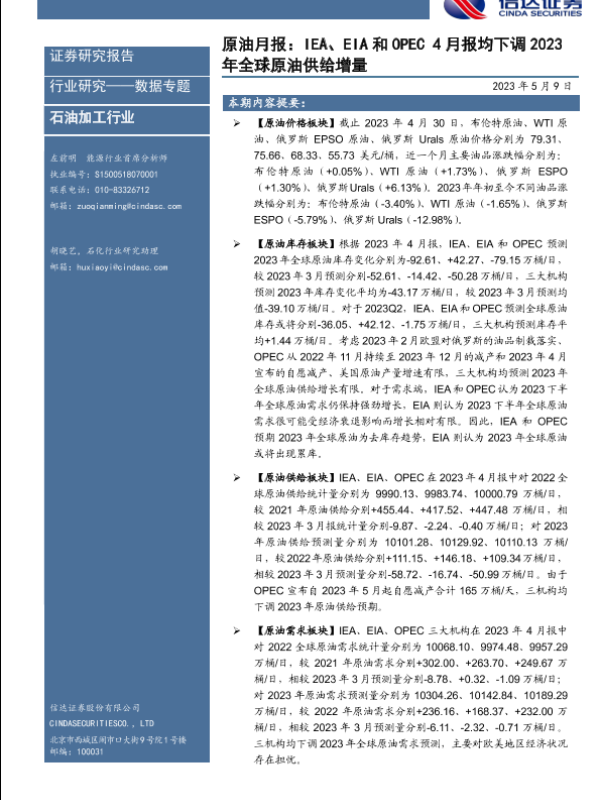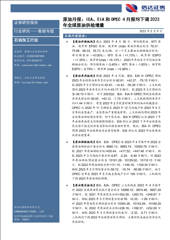 【信达证券】【20230509】原油月报:IEA、EIA和OPEC4月报均下调2023年全球原油供给增量-27页