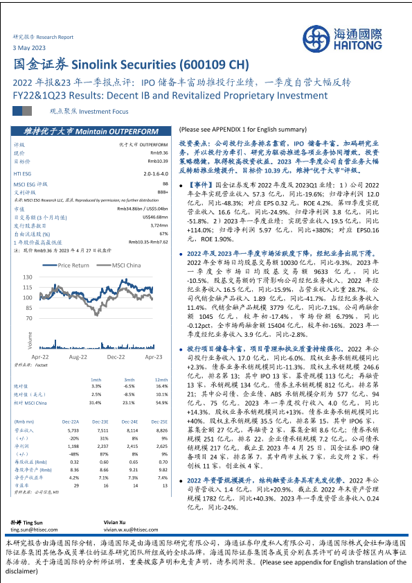 【海通国际】【20230508】国金证券(600109)2022年报&23年一季报点评:IPO储备丰富助推投行业绩,一季度自营大幅反转-15页