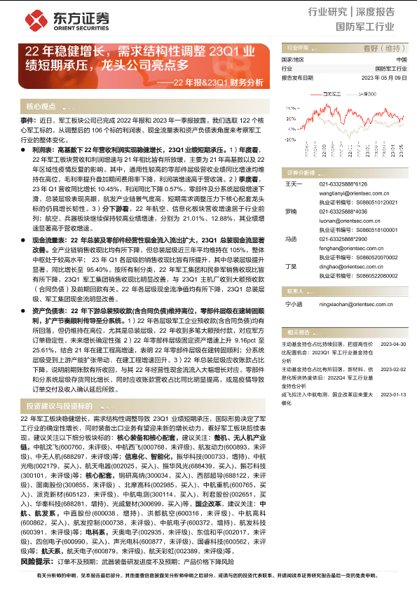 【东方证券】【20230509】国防军工行业22年报&23Q1财务分析:22年稳健增长,需求结构性调整23Q1业绩短期承压,龙头公司亮点多-26页