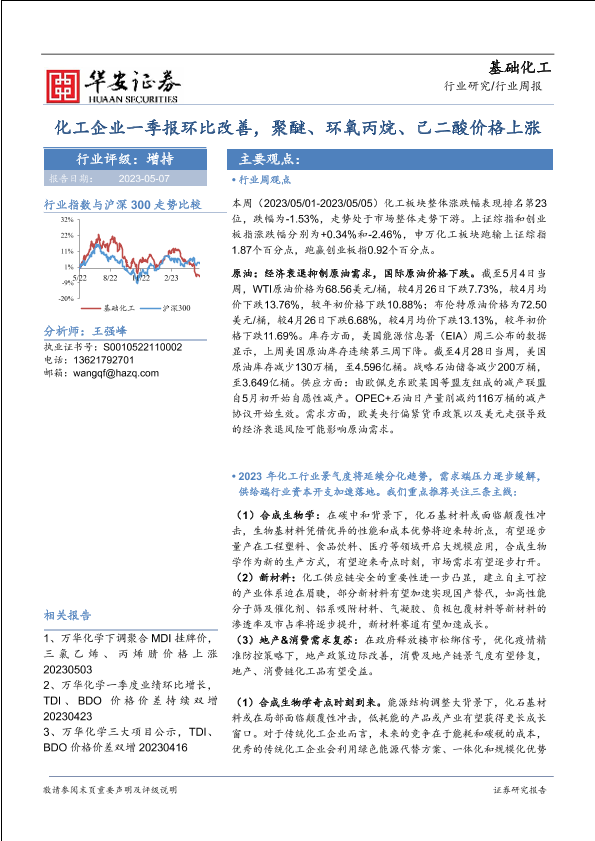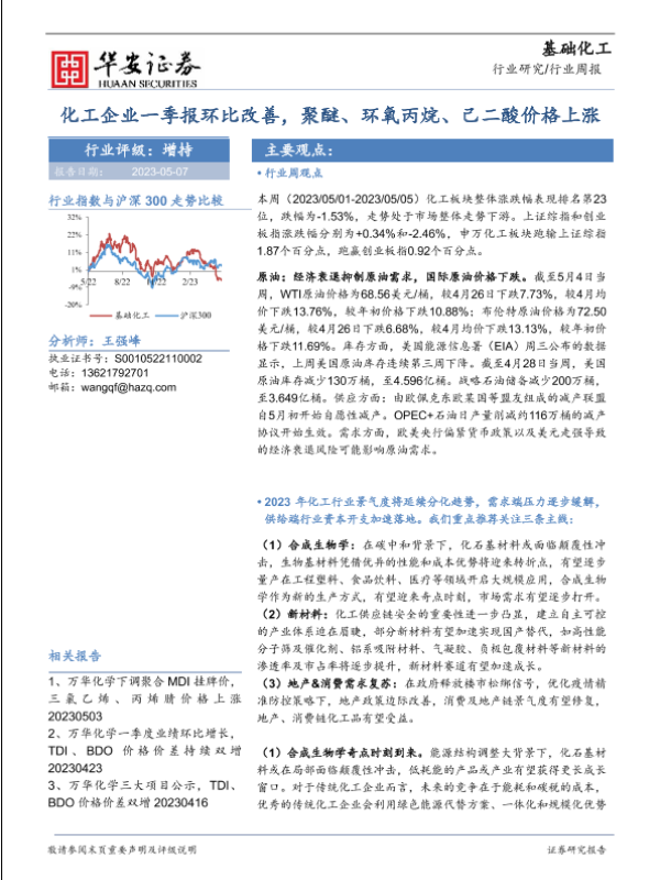 【华安证券】【20230507】基础化工行业周报:化工企业一季报环比改善,聚醚、环氧丙烷、己二酸价格上涨-43页