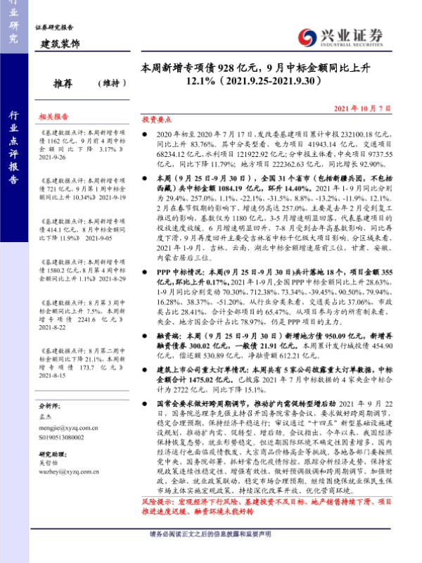 【兴业证券】【20211007】建筑装饰行业:本周新增专项债928亿元,9月中标金额同比上升12.1%-28页