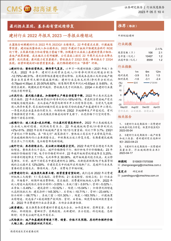 2023一季报 业绩综述 基本面修复 建材行业 盈利拐点