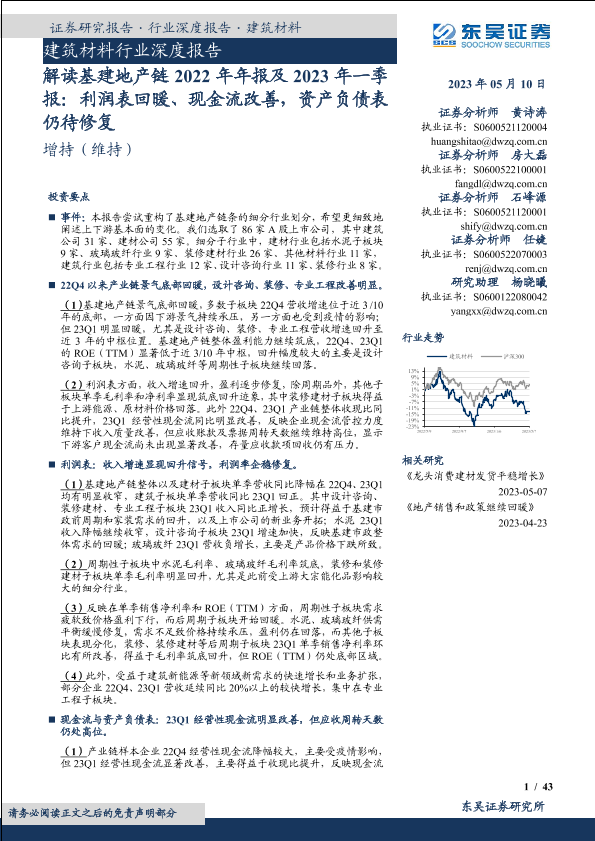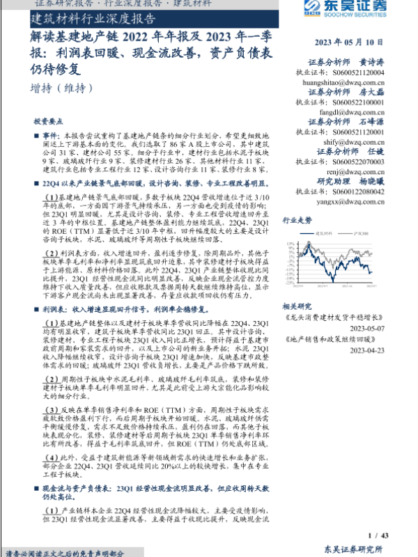 【东吴证券】【20230510】建筑材料行业深度报告:解读基建地产链2022年年报及2023年一季报:利润表回暖、现金流改善,资产负债表仍待修复-43页