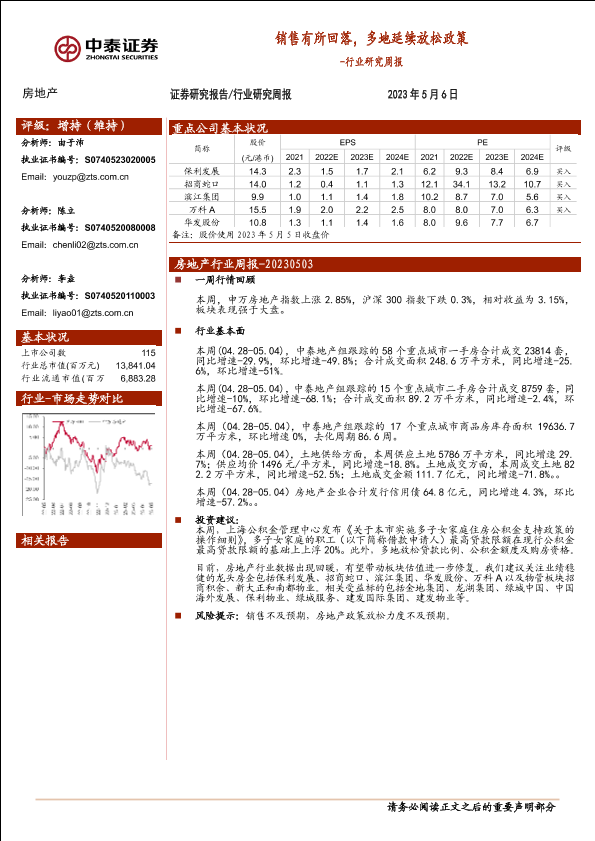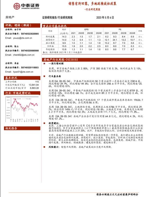 【中泰证券】【20230506】房地产行业研究周报:销售有所回落,多地延续放松政策-18页