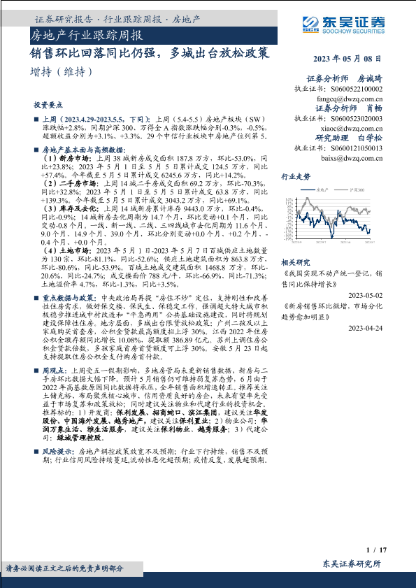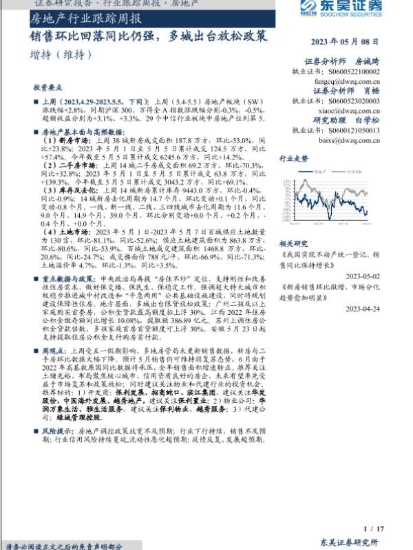 【东吴证券】【20230508】房地产行业跟踪周报:销售环比回落同比仍强,多城出台放松政策-17页