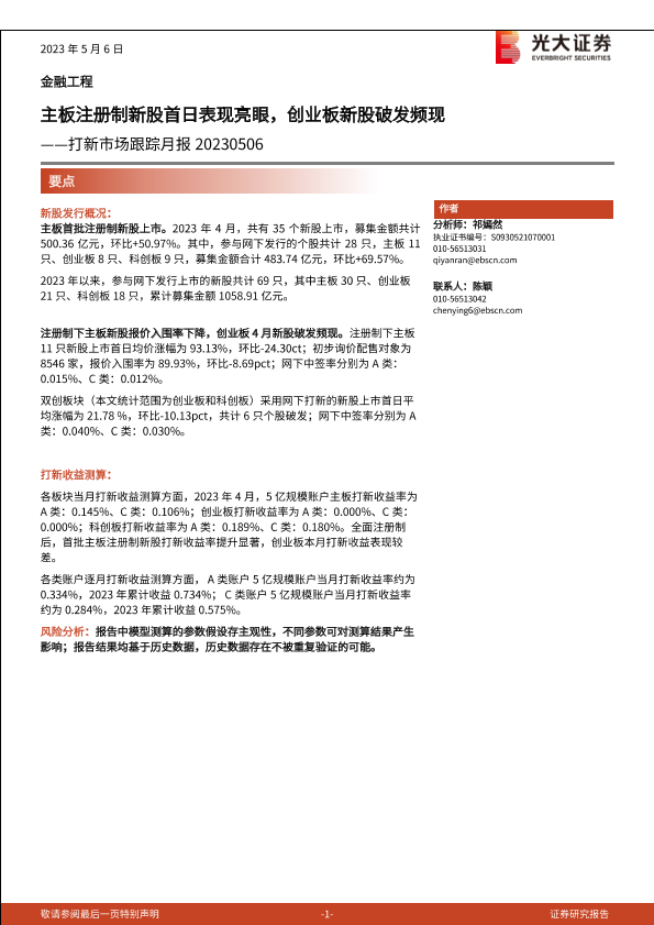 【光大证券】【20230506】打新市场跟踪月报:主板注册制新股首日表现亮眼,创业板新股破发频现-15页