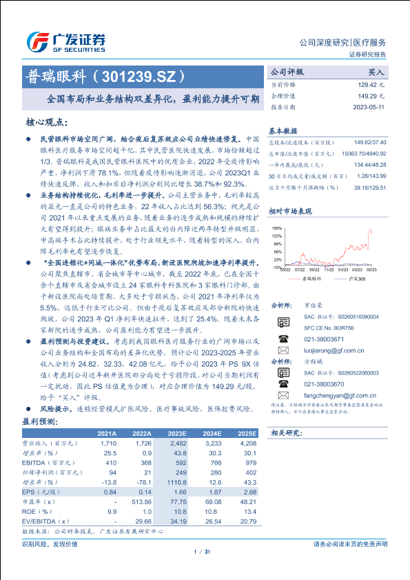 【广发证券】【20230511】普瑞眼科(301239)全国布局和业务结构双差异化,盈利能力提升可期-31页