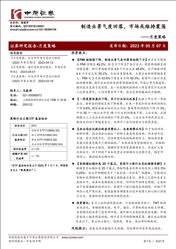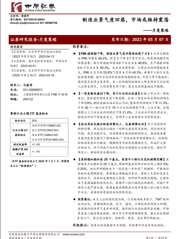 【中原证券】【20230507】月度策略:制造业景气度回落,市场或维持震荡-21页