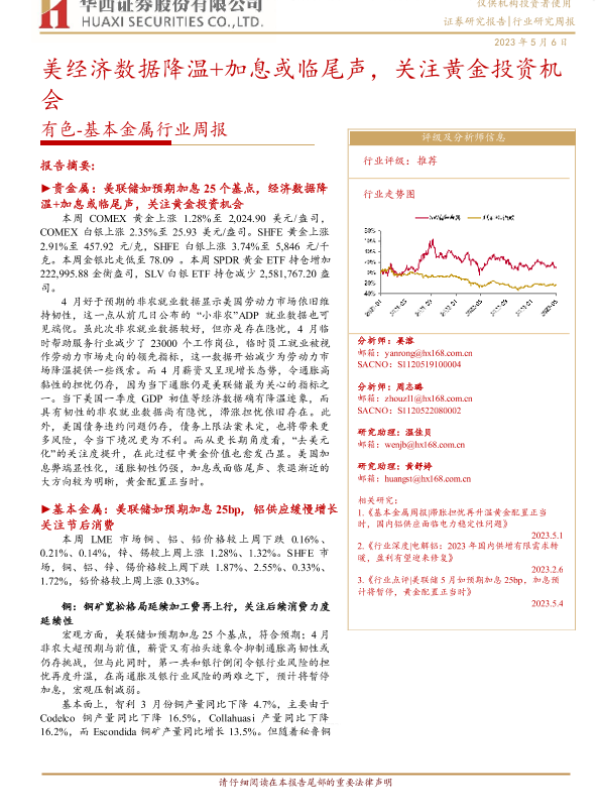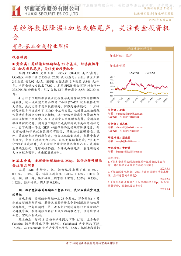 【华西证券】【20230506】有色-基本金属行业周报:美经济数据降温+加息或临尾声,关注黄金投资机会-23页