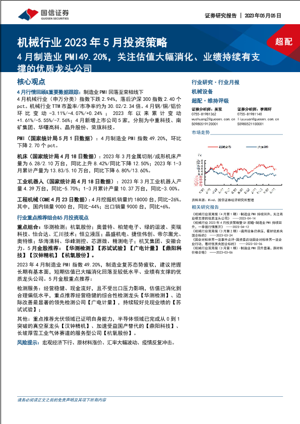 【国信证券】【20230505】机械行业2023年5月投资策略:4月制造业PMI49.20%,关注估值大幅消化、业绩持续有支撑的优质龙头公司-25页