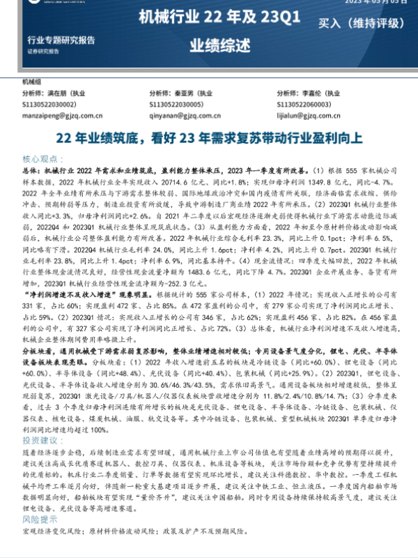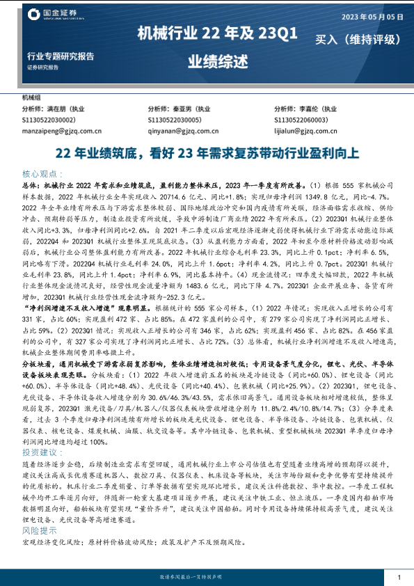 【国金证券】【20230505】机械行业22年及23Q1业绩综述:22年业绩筑底,看好23年需求复苏带动行业盈利向上-25页