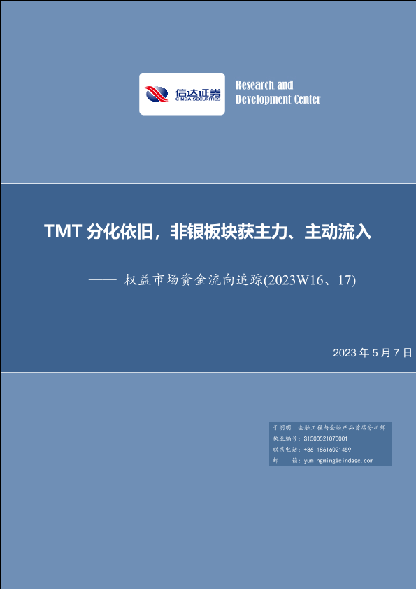 【信达证券】【20230507】权益市场资金流向追踪(2023W16、17):TMT分化依旧,非银板块获主力、主动流入-15页