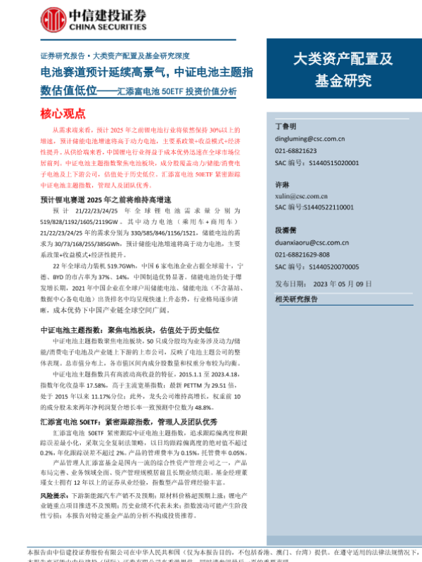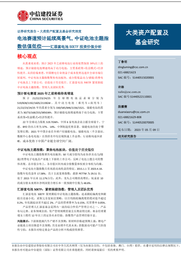 【中信建投证券】【20230509】汇添富电池50ETF投资价值分析:电池赛道预计延续高景气,中证电池主题指数估值低位-22页