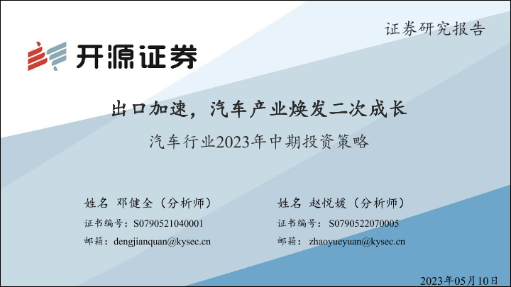 【开源证券】【20230510】汽车行业2023年中期投资策略:出口加速,汽车产业焕发二次成长-33页