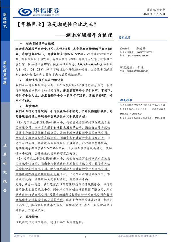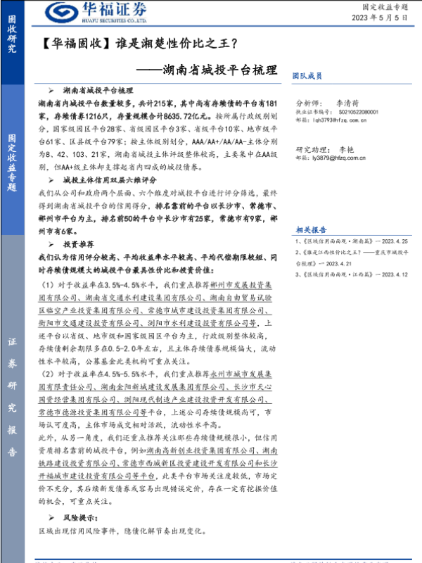 信用分析 城投平台 投资推荐 湖南省 风险提示