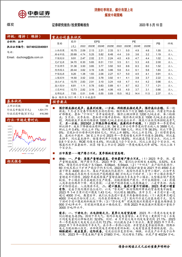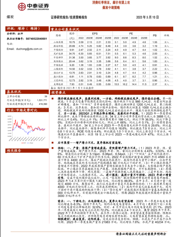 【中泰证券】【20230510】煤炭中期策略:消费旺季将至,煤价有望上攻-32页
