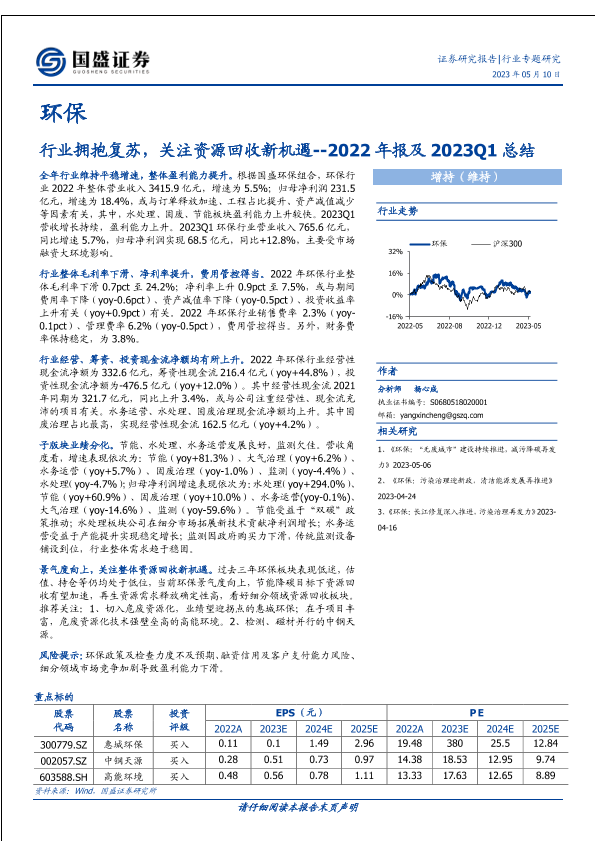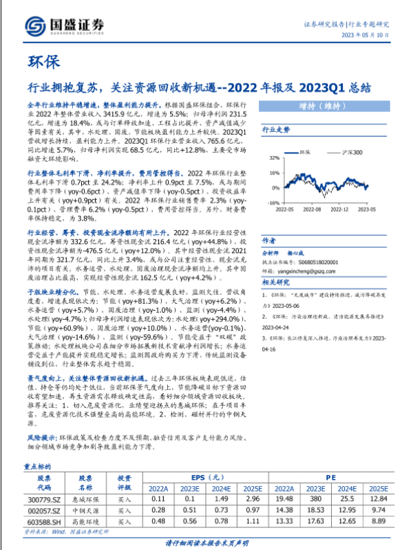 【国盛证券】【20230510】环保2022年报及2023Q1总结:行业拥抱复苏,关注资源回收新机遇-21页