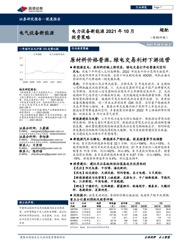 【国信证券】【20210930】电力设备新能源行业2021年10月投资策略:原材料价格普涨,绿电交易利好下游运营-26页