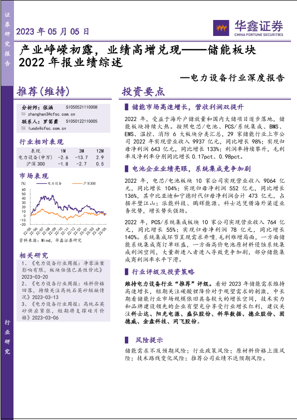 【华鑫证券】【20230505】产业峥嵘初露,业绩高增兑现——储能板块2022年报业绩综述-18页