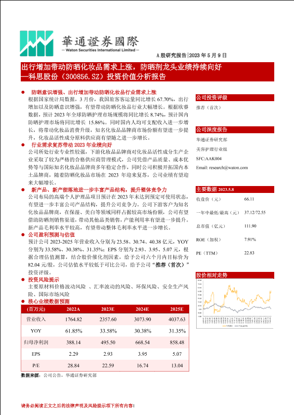 【华通证券国际】【20230509】科思股份投资价值分析报告(300856):出行增加带动防晒化妆品需求上涨,防晒剂龙头业绩持续向好-22页