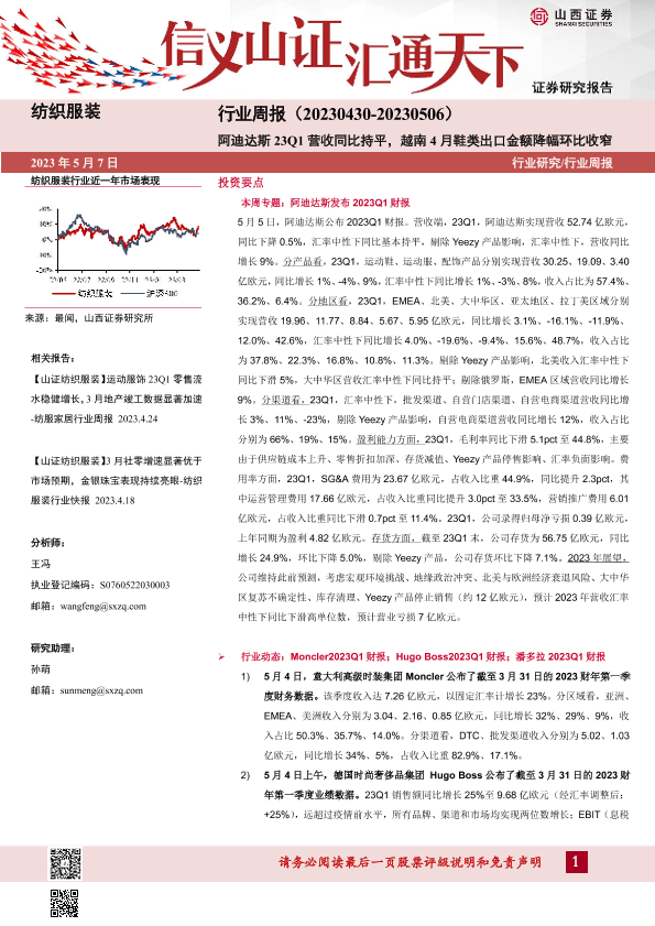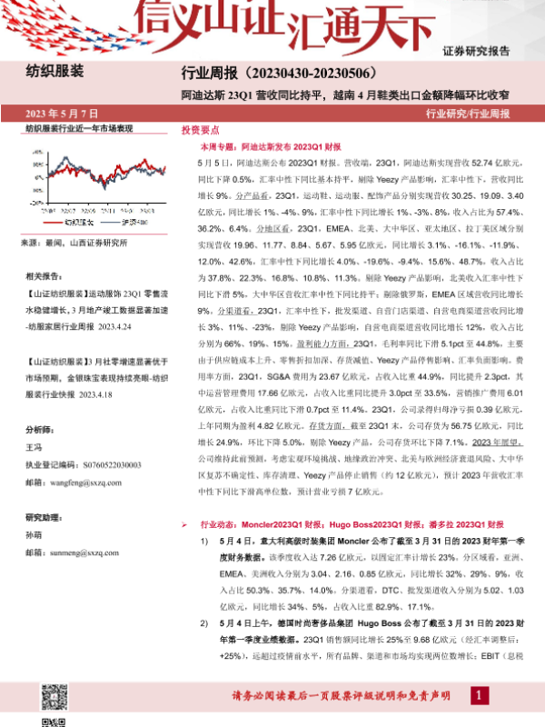 【山西证券】【20230507】纺织服装行业周报:阿迪达斯23Q1营收同比持平,越南4月鞋类出口金额降幅环比收窄-23页