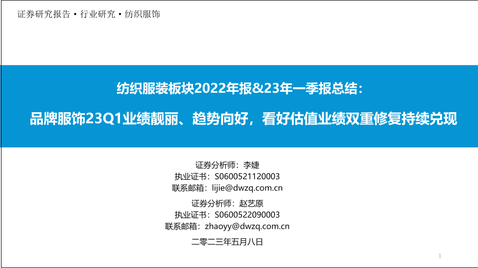 【东吴证券】【20230508】纺织服装行业板块2022年报&23年一季报总结:品牌服饰23Q1业绩靓丽、趋势向好,看好估值业绩双重修复持续兑现-39页