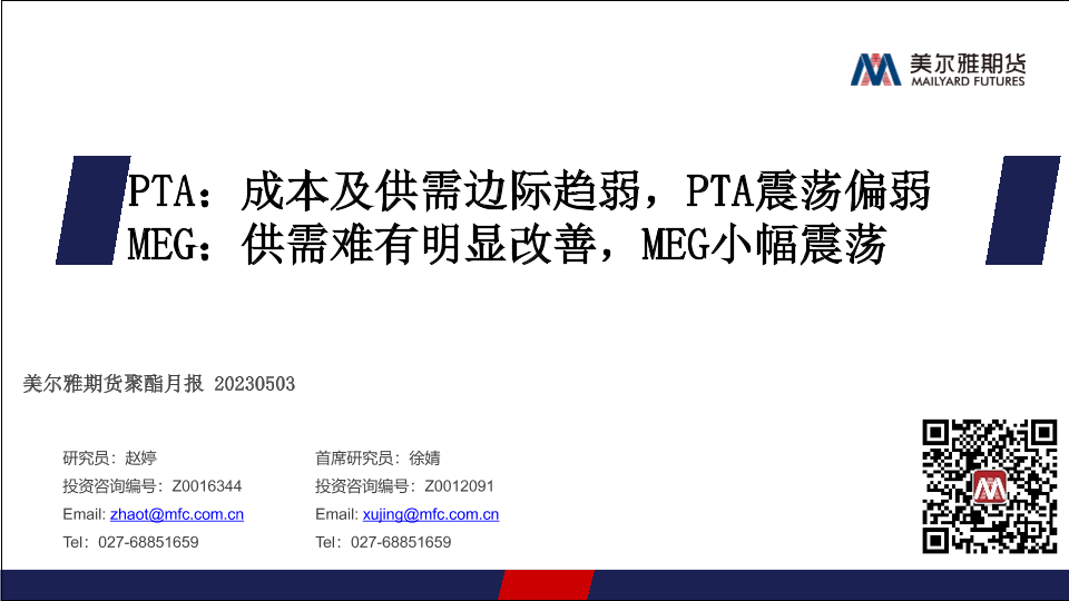 【美尔雅期货】【20230503】聚酯月报:PTA,成本及供需边际趋弱,PTA震荡偏弱,MEG,供需难有明显改善,MEG小幅震荡-23页