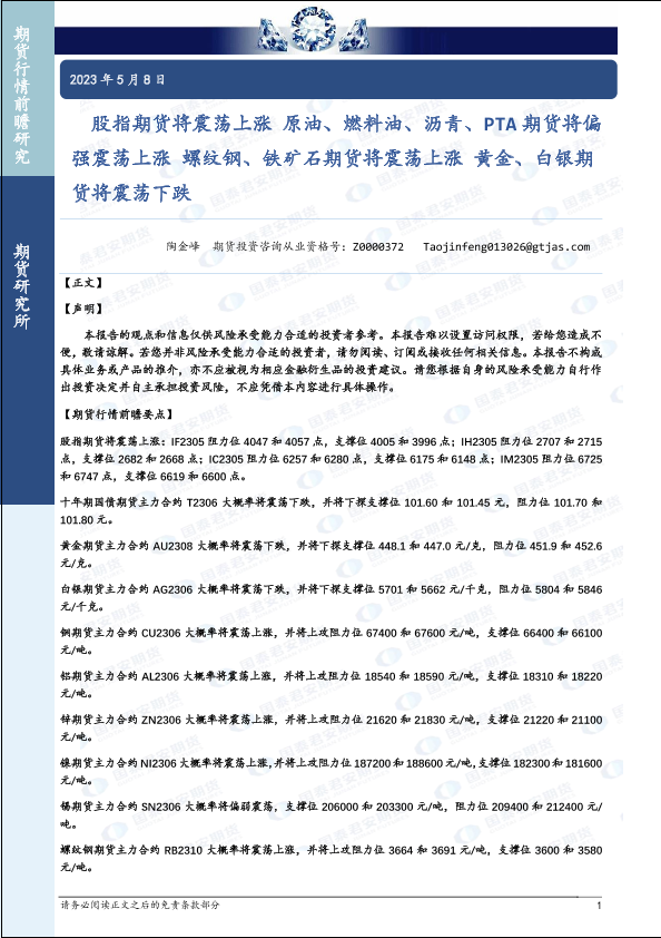 【国泰君安期货】【20230508】股指期货将震荡上涨原油、燃料油、沥青、PTA期货将偏强震荡上涨螺纹钢、铁矿石期货将震荡上涨黄金、白银期货将震荡下跌-44页